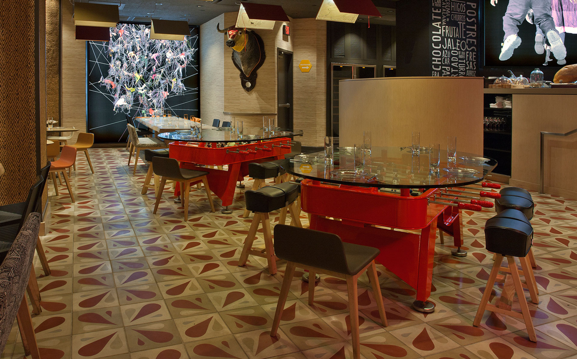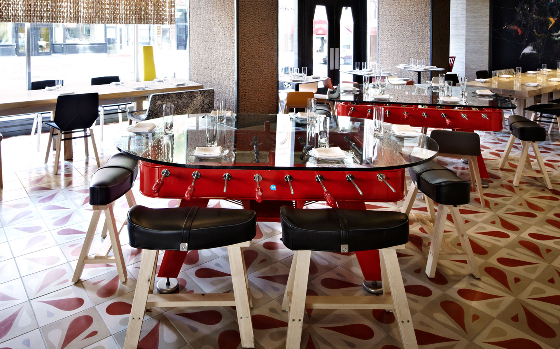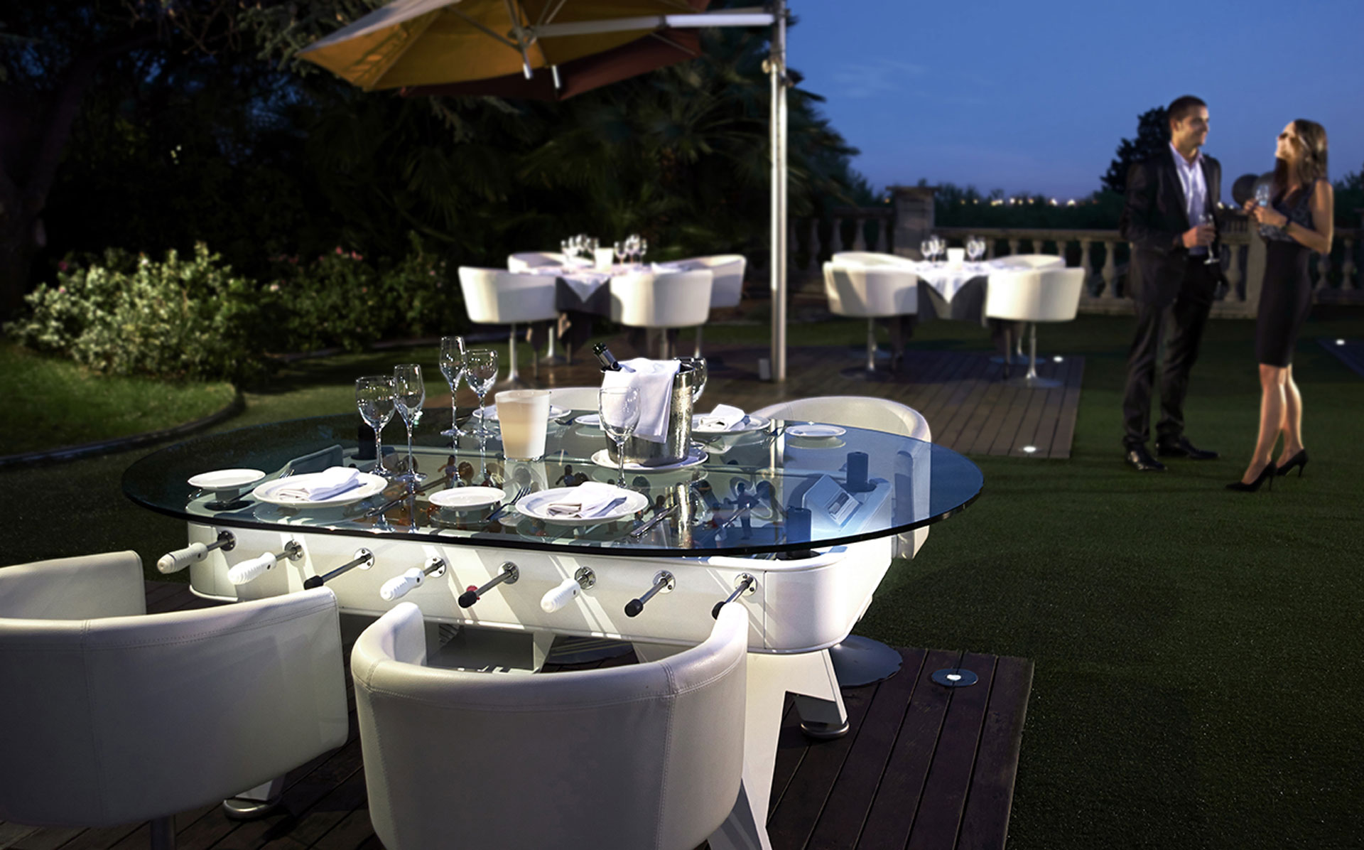 Der Kicker-Esstisch kann entweder im Haus oder im Garten stehen und bietet 7 Farbe-Optionen (Tisch für den Garten kann bei einem Aufschlag aus Edelstahl gebaut werden.